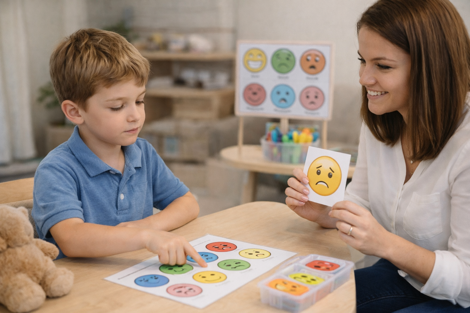 Therapists take a moment to name the emotion before talking about what happened. This helps kids see that feelings aren’t wrong, but there are better ways to show them. Over time, children begin to tell you how they feel instead of acting out.